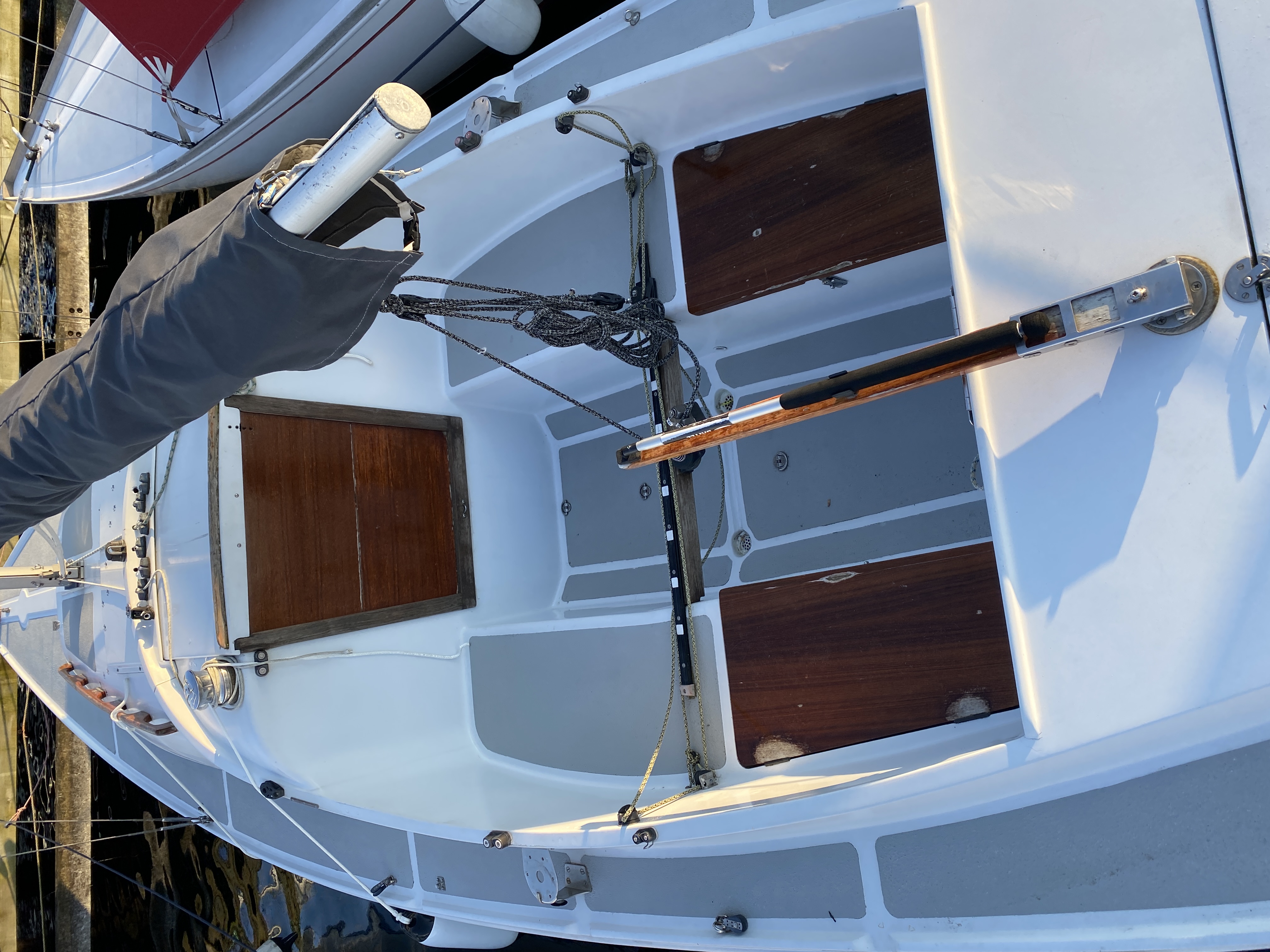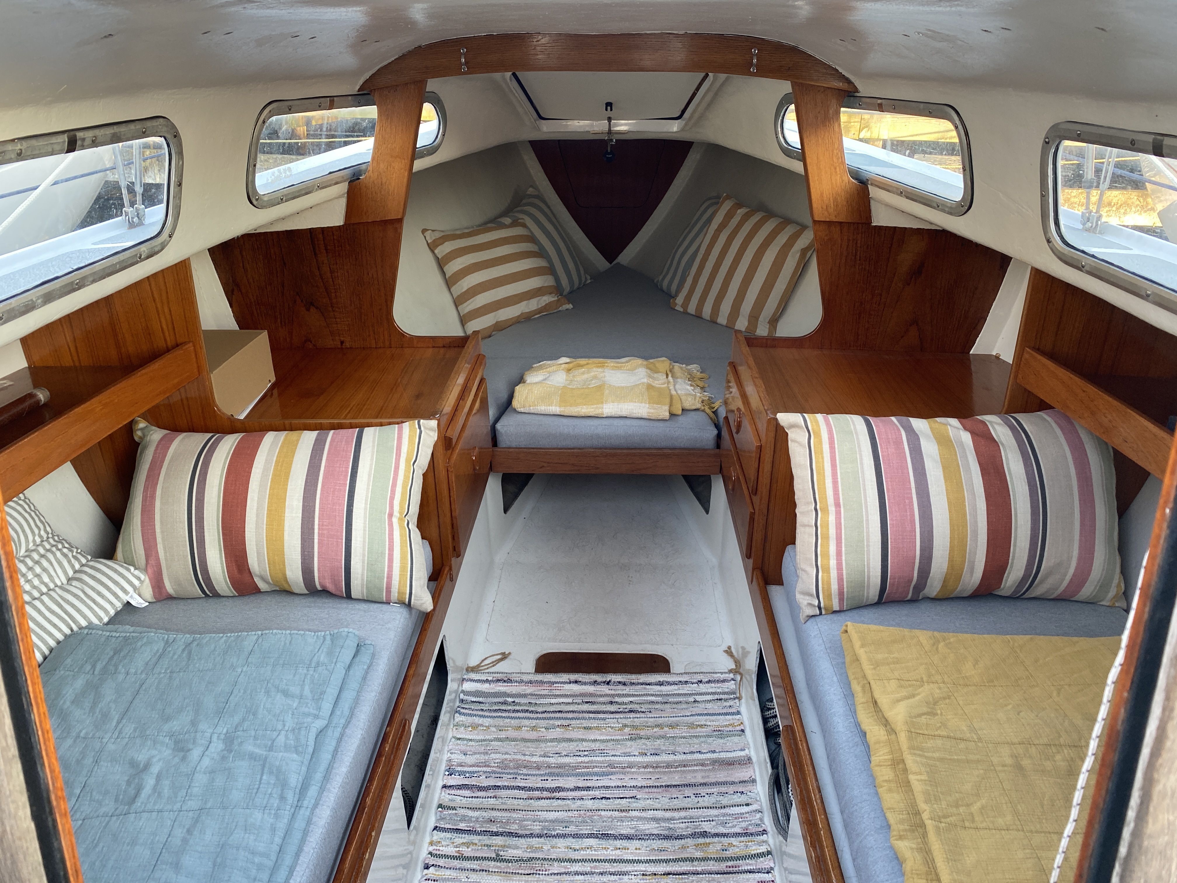 Der medfølger to storsejl, to forsejl, anker, Epropulsion el påhængsmotor (nypris 45.000kr).